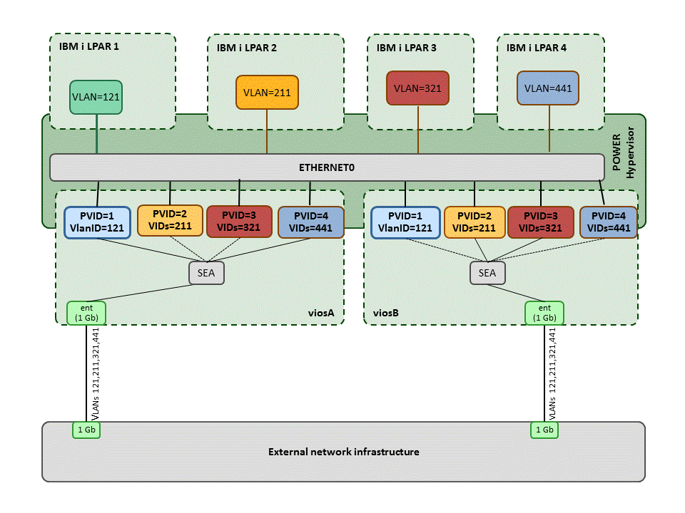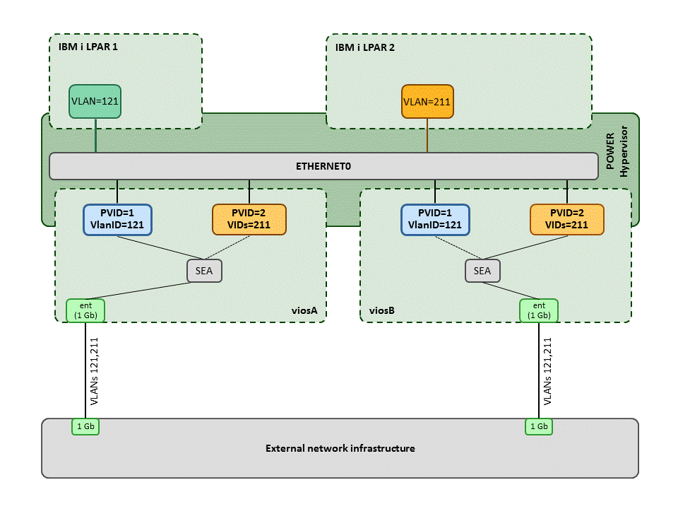 If you use SEA on VIOS, the most efficient mode is SEA failover with load sharing. Where both Ethernet adapters on VIOS pair can be utilized at the same time. But you need at least two VLANs to be handled.  You couldn’t use this mode in conjunction with IBM i, because the OS does not offer a VLAN tagging.
