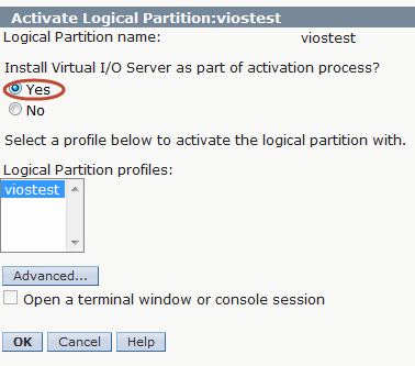 4. Select your brand new VIOS partition profile, and click Operations – Activate – Profile and select Yes for Install Virtual I/O Server as part of activation process?