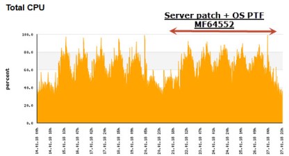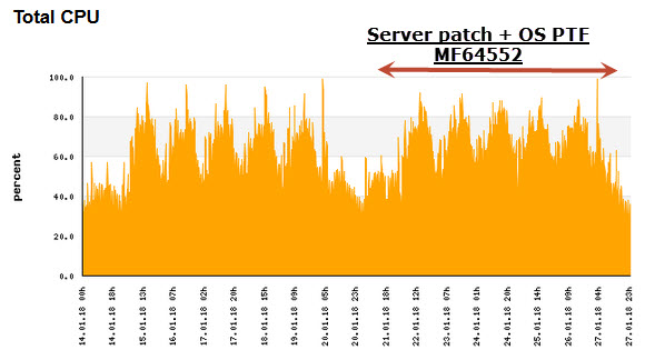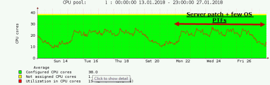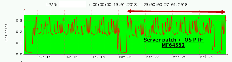 This graph represents a CPU pool with 38 allocated CPUs. Over the weekend 20/21st January, the machine gets a firmware patch and few OS instances get PTF MF64552. As you can see, there is almost the same utilization, no spectacular grow.