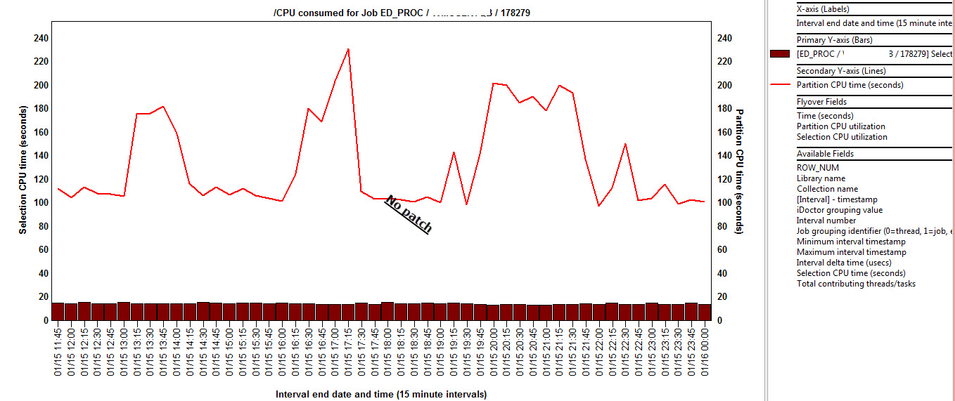 Another funky iDoctor graphs shows how much CPU time was used for this specific job (small brown bars) vs total CPU for entire Lpar. Left graph before patches, right one with patches. There is no difference again.