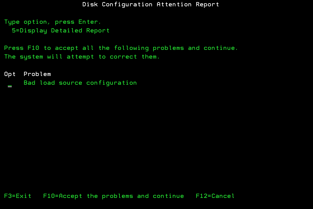 Just press F10 and accept the problem. I hope the OS will start again from ‘invalided’ Load Source disk :). You will not see the error within next IPL.