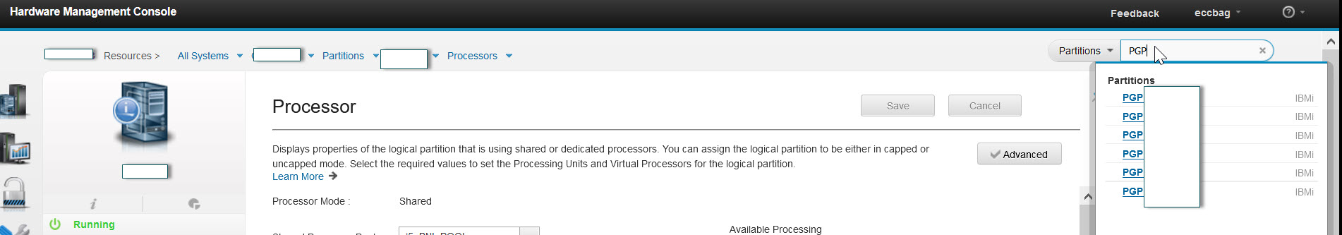 Another function is Global search – it allows quick navigation between LPARs, servers, VIOSes. For instance imagine, that you have LPARs named PGP0001, PGP0002, PGP0003 on different servers. Using the global search lists all partitions with PGP in the name, you can pick one and the interface will take you to the properties of selected LPAR. The global search is always shown in the right top corner.