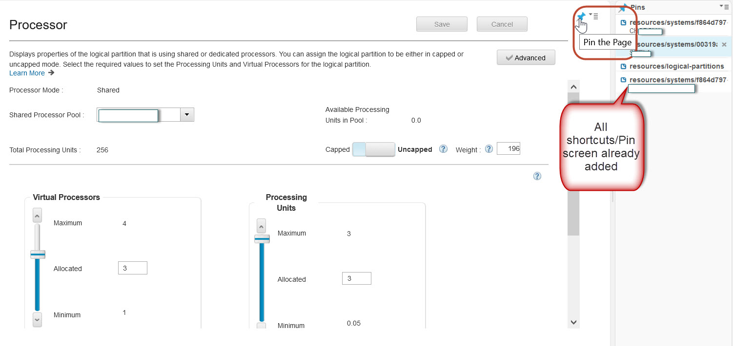 Another useful function is “Pins”. In another word it is creating Shortcuts. It allows to open the screen/menu to the specific function in one click. For instance, if you very often modify CPU setting on an LPAR, usually, you need to select the Server, then the Partition, and click on General Properties which will open the window where the CPU configuration may be modified. Using Pins functionality, you can get the screen on “one click” and save significant time (you don’t have to wait on each screen to be loaded). In order to add the screen to the shortcut/Pins, click the blue pin in the right corner, and the function will be added to the Pins section.